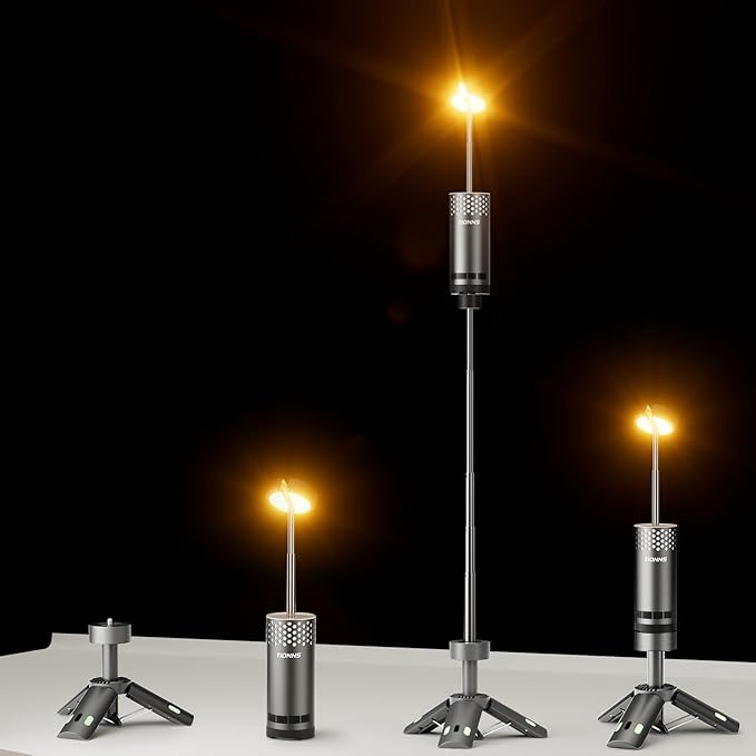 • Compact, Portable & Detachable Design--- This detachable camping light is lightweight (1.1 lbs) and compact (2 x 11.4 inches), fitting easily into any backpack or pocket. Fully extended to 37.6 inches (95.5 cm), it provides ample brightness as a telescopic camping light. The detachable light head (2 x 5.5 inches) features a magnetic base and hook, allowing secure attachment to metal surfaces or hanging. The stand (2 x 5.9 inches) ensures stable and flexible lighting, featuring a 1/4" nut for compatibility with tripods and camping gear. Whether for camping, hiking, or emergencies, this rechargeable camping lantern offers versatile, hands-free lighting for any outdoor adventure.