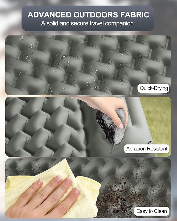 • [Rugged, Quick-Dry Material for Outdoor Use] - Made of upgraded 50D nylon and TPU, this camp sleep pad is tear-resistant, water-repellent, and built to handle rough ground like sand, rocks, or wet grass. Even after a rainy night, it dries fast and stays tough