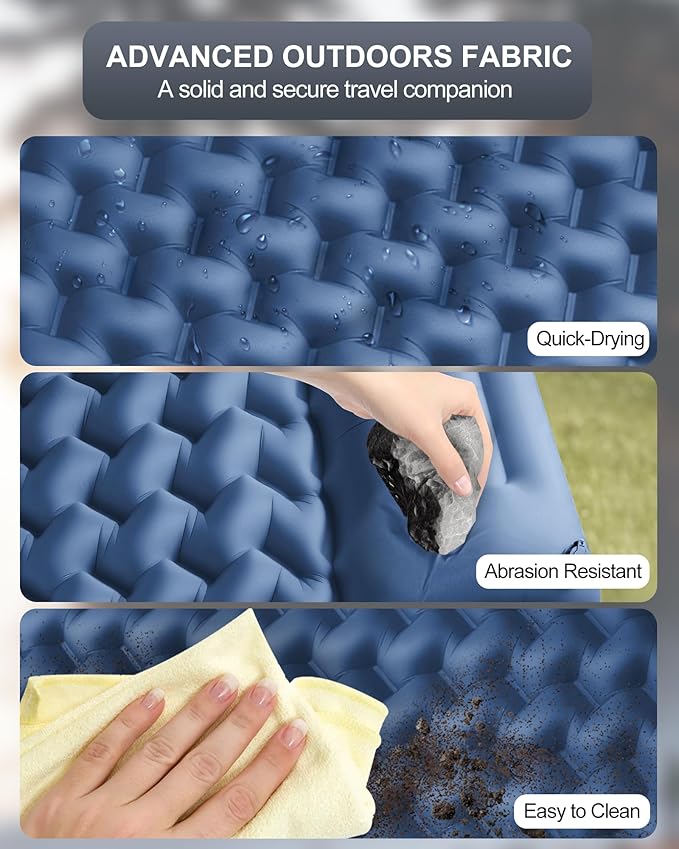 • [Rugged, Quick-Dry Material for Outdoor Use] - Made of upgraded 50D nylon and TPU, this camp sleep pad is tear-resistant, water-repellent, and built to handle rough ground like sand, rocks, or wet grass. Even after a rainy night, it dries fast and stays tough