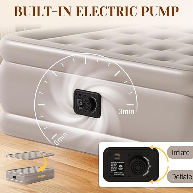 • QUICK SELF INFLATING: Built-in high-speed pump (120VAC, 60Hz, 1.2A) with dual air chambers for rapid inflation/deflation (under 3 minutes),Simply plug into any standard US outlet (110-120V) and inflate in minutes—no extra tools needed!