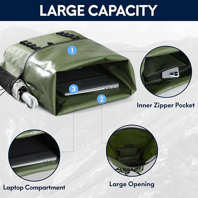 • Waterproof Roll Top Backpack: The sealed roll opening design not only provides an extra layer of waterproofing so you can tightly seal your backpack, but also provides the flexibility to adjust the capacity. A Simple and effective clip buckle ensures a secure closure, keeping your gear safe and dry. 2 different roll closure styles add to the variety of carrying options