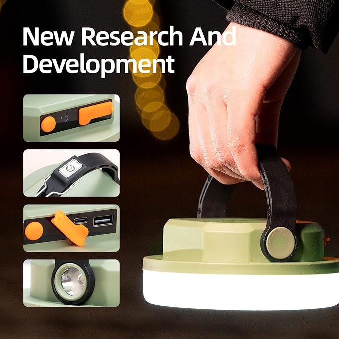 • Rechargeable 10400mAh Battery and Long-Lasting: Our Rechargeable Camping Light Stay powered through emergencies with our USB-rechargeable lantern (Each light comes with a Type-C wire).Led Lantern Rechargeable Features an 10400mAh battery last 6-8 hrs on high mode or 300 hrs on low.Beyond being a bright light source, this camping solar lantern serves as a portable powerbank for charging phones, a hanging lamp for tents, and a handheld flashlight. An excellent choice for camping gifts for men