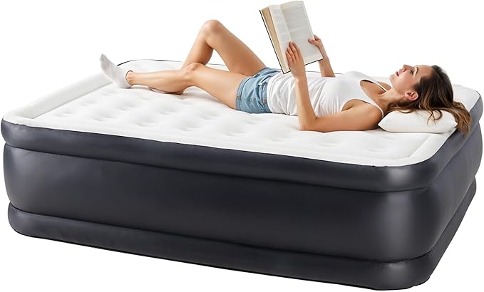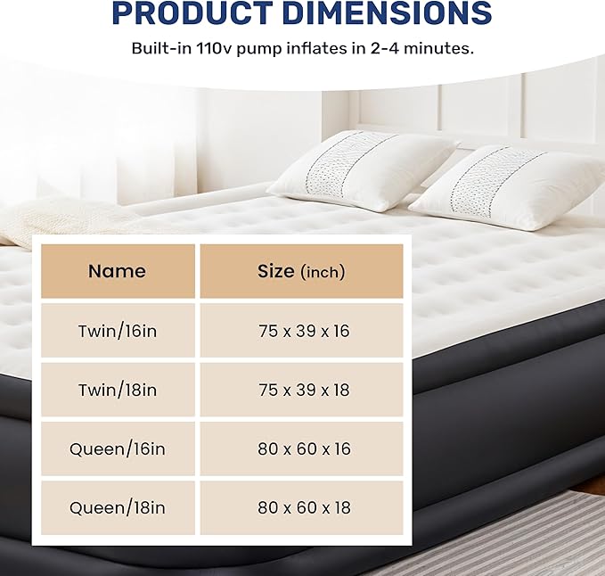 • Bulit-in high capacity pump: The air mattress is equpped with a high-speed built-in 110V high power electric air pump. The air bed can be inflated/deflated in minutes at the push of a button in under 200s for 18in queen size, perfect for home or travel