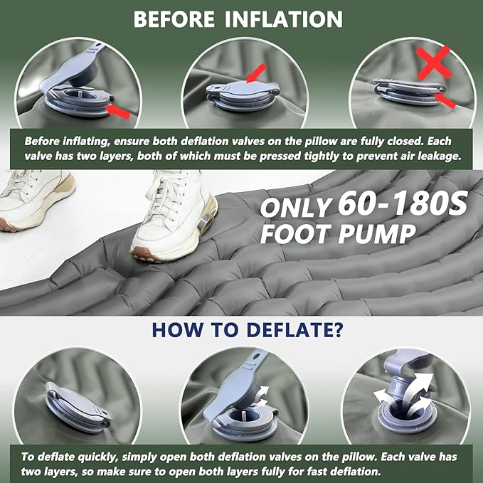 • 【Fast Foot Pump to Inflate & 1s Deflation】No need for hands, mouth, or a pump to inflate our self-inflating camping sleeping pad. Simply step on the built-in foot pump, and it will fully inflate in 1-3 minutes. Additionally, the two dual-layer valves on the pillow of the air mattress effectively prevent air leakage and allow for quick deflation. Note: Be sure to close the two valves on the back of the pillow before inflating.