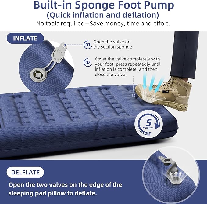 • 【Double Valve-30S Inflate 1S Deflate】 Sleeping pad design with integrated foot pump, No more manual pumping or carrying extra tools! Our high-resilience sponge foot pump allows quick inflation, saving time and energy. Simply step to inflate, then unplug the valve for instant deflation and compact storage. Perfect for campers who value convenience and efficiency.