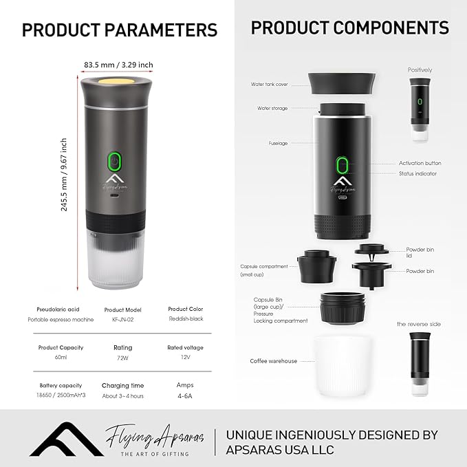 • ✅【UPGRADED One-Button Operation Espresso Coffee Maker】Apsaras portable espresso coffee maker is a great device for flavored espresso lovers. You can easily enjoy espresso on the go, even without an espresso machine—just one tap, no matter where you are. Compact coffee maker is easy to use, efficient, and delivers a delicious cup of espresso every time.