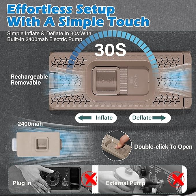 • Easy To Store&Carry: After deflation, the thickness of foam sleeping mats for camping is compressed by more than 50%, making it easier to store and save space compared to ordinary sponge sleeping pads. Camping mattress pad suitable for tent camping, SUV camping travel, and car travel. The camping sleeping mat contains a 2400Ah large capacity battery, which has enough power to fill the inflatable camping mat about 7 times. Making USB-C charging more convenient. The full charging time is 2-3 hours