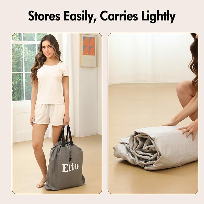 • Versatile & Travel-Ready. Whether you're hosting overnight guests, visiting family, or heading out on a camping trip, the Etto air mattress is your go-to portable comfort solution. Weighing just 14 lbs and packed in a convenient storage bag, it’s easy to take anywhere and simple to store when not in use