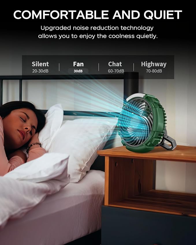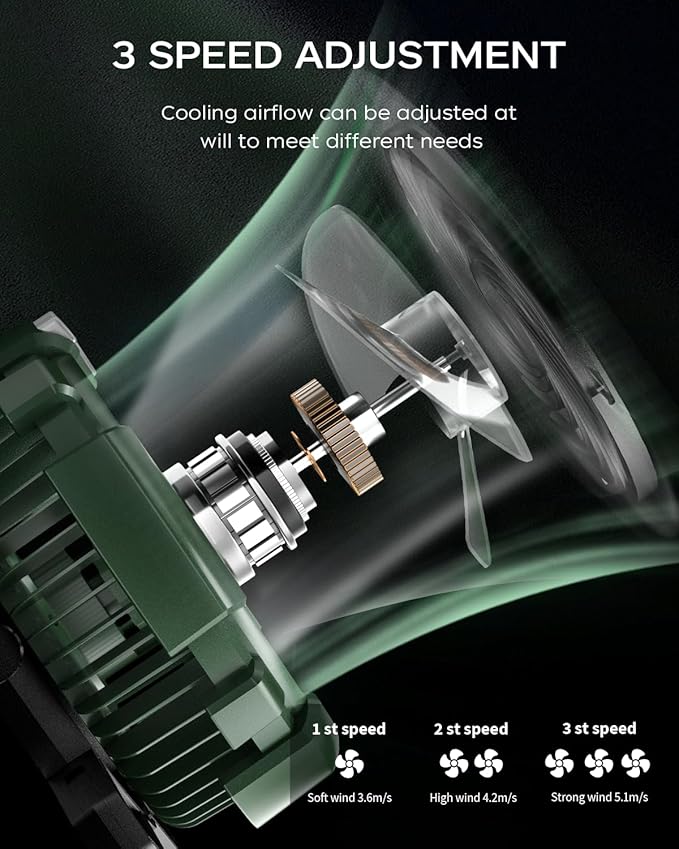 • [Compact Durability] Our portable camping fan is compact yet sturdy, designed to accompany you on all your journeys. Easily pack it away in your backpack when not in use. It‘s your ideal companion for camping, fishing, hiking, and beyond!.