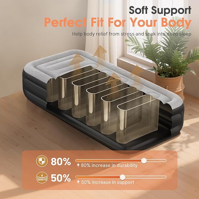 • 【Built-In Electric Pump for Quick Inflation】Equipped with a 110V built-in electric pump, this twin inflatable mattress inflates or deflates in under 2 minutes with just a simple turn of the knob. Adjust the firmness to your preference easily, and when you’re done, store the power cord in the integrated storage box for a neat and hassle-free setup