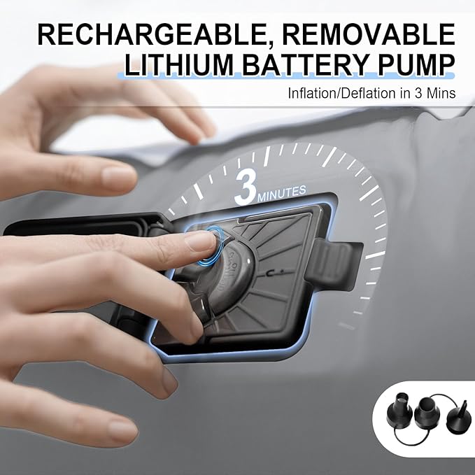 • 【3-Min Fast Inflation USB-C Pump】This inflatable bed with built-in pump includes a powerful rechargeable lithium battery (USB-C charging)! Inflate your queen air mattress in just 3 minutes—no outlets needed. Take it camping, traveling, or use it at home hassle-free!