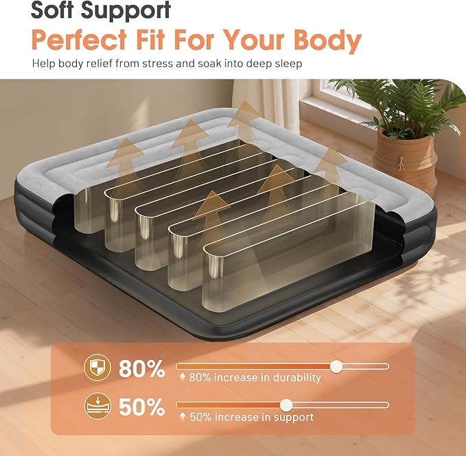 • 【Enhanced Thickness & Anti-Slip Base】Crafted from eco-friendly, durable material that’s 30% thicker than standard options, this air mattress King with built in pump is designed to resist punctures and leaks, even from playful pets. The anti-slip base keeps the inflatable mattress firmly in place, reducing noise and ensuring a peaceful, quiet sleep