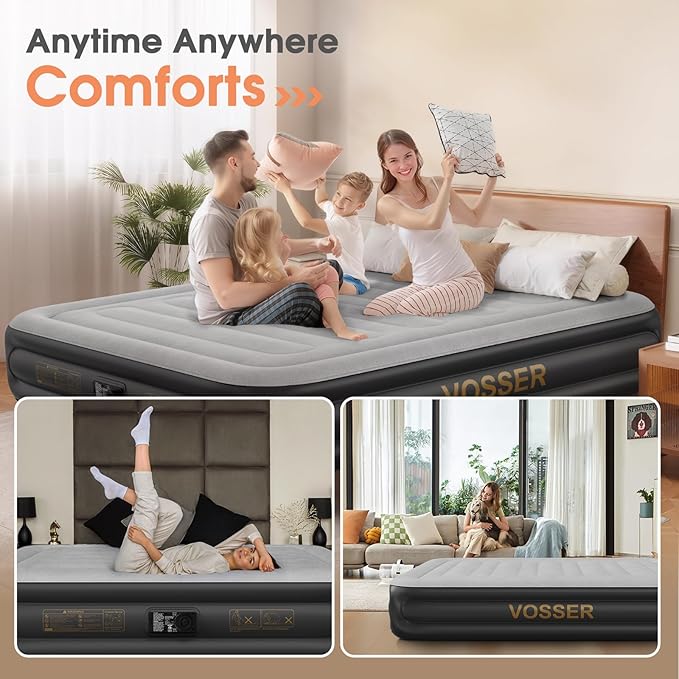 • 【Luxuriously Soft Waterproof Flocked Top】VOSSER 15'' King air Mattress features a plush, waterproof flocked surface that’s smooth, easy to clean, and offers ultimate comfort, ensuring a restful night’s sleep. Enjoy a luxurious sleeping experience with this thoughtfully designed mattress