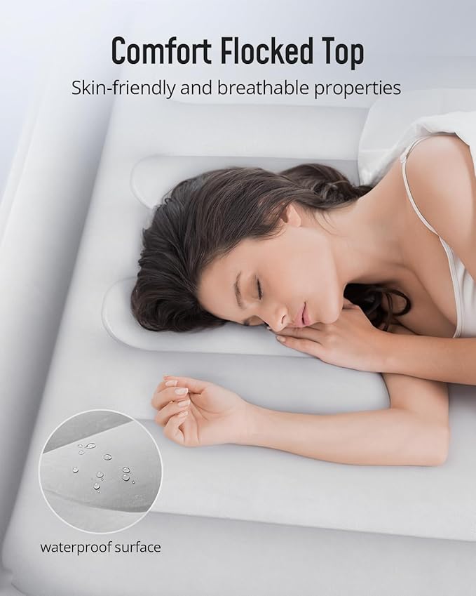 • Comfort Sleep: Queen air mattress with built in pump has flocked top not only skin-friendly but also waterproof, meanwhile, non-slip bottom provides blow up mattress queen more stable and reduces noise.