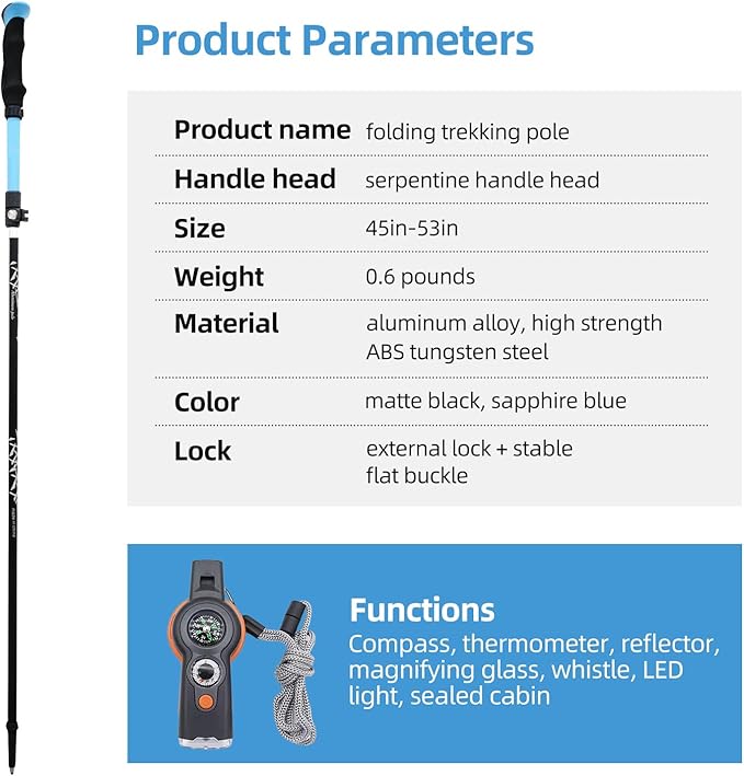 • Lightweight & Durable Materials: Crafted from aircraft-grade aluminum alloy, our collapsible trekking poles weigh less than 0.7 pounds, making them easy to carry on long hikes while providing robust support for outdoor activities like hiking, camping, and climbing