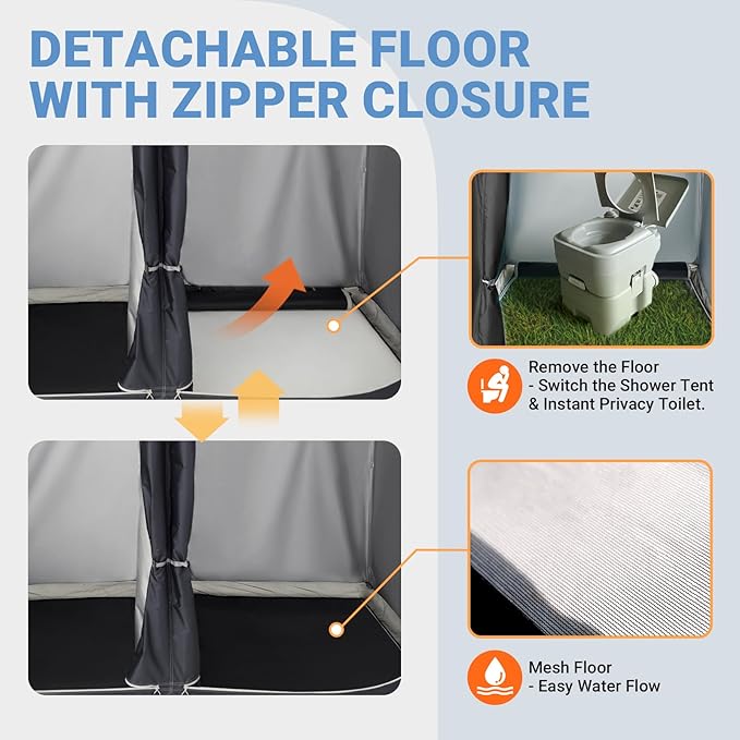 • VERSATILE FOR CAMPING OUTDOOR - Our versatile shower tent features inside pockets for small items, rope for hanging clothes or towel, and sturdy hook for your solar shower head. Transform it into a changing room, camp bathroom, shower pod, portable instant toilet tent, or camping privacy tent. The adjustable zipper closure floor mat adds flexibility to suit your needs.