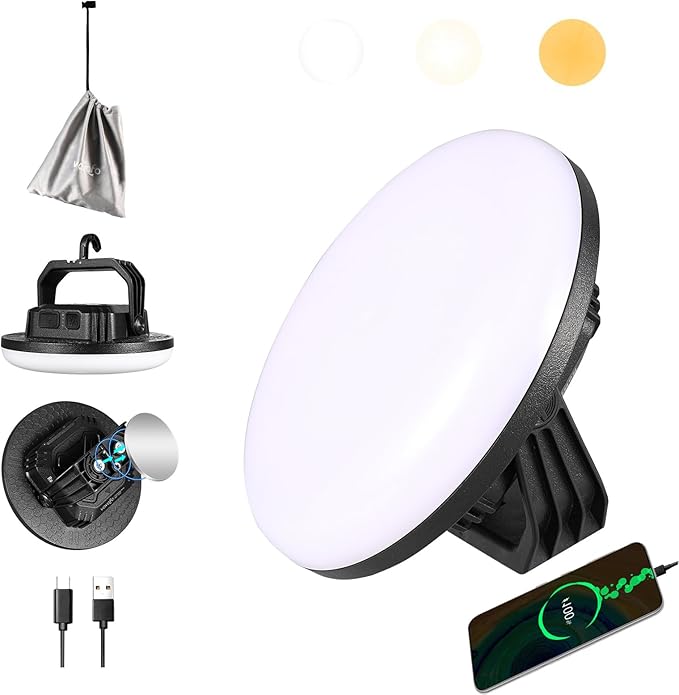 • [3 lighting modes & Stepless Dimming]: Our camping lights is dimmable, Short press to switch between 3 lighting modes (3500K/5500K/9000K), Long press to adjust brightness, providing you with the perfect lighting for any occasion, whether it's a cozy campfire setting or a bright emergency situation.