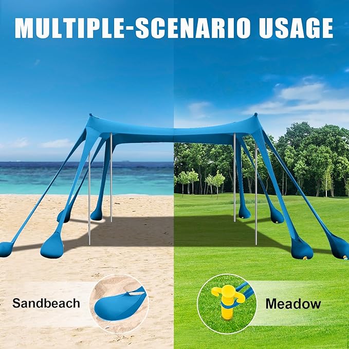 • 【Lightweight and easy to set up】This beach shade only 8lbs,comes with a compact & lightweight carrying bag,fits into most car trunks,you can easily take it anywhere.The beach shade canopy tent can be quickly installed by one person in a few minutes.Just lay the beach tent on the ground, stretch it to maximum, fill the sandbags, tie the beach shelter onto the poles, then insert into the ground,fix pegs with sandbags,and you'll get a perfect beach sun shade canopy