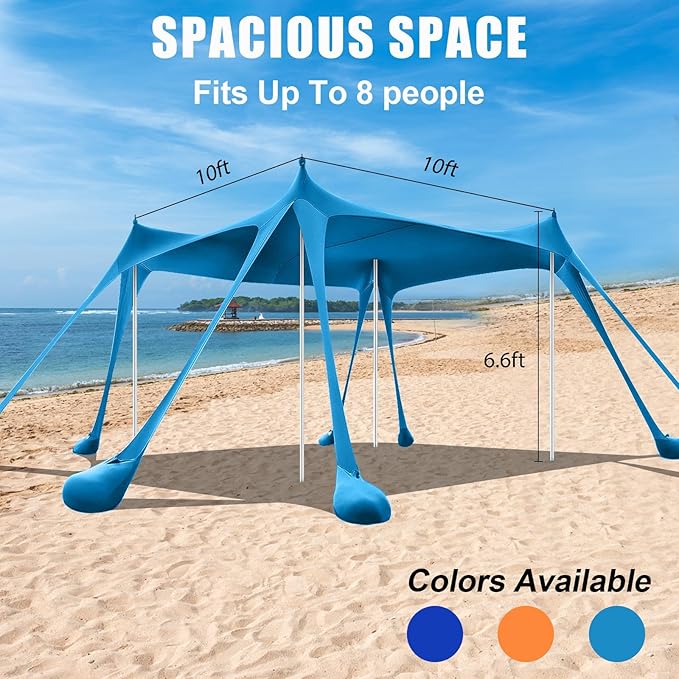 • 【Spacious Space】This beach sun shade canopy is 10x10ft, the poles and sandbags can adjust the angle and height when the sun moves,you needn't spend time moving the entire beach tent.This tent for beach has enough space to comfortably accommodate 6-8 people