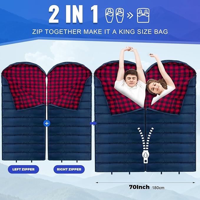 • Features: Two single sleeping bags(left and right)can be zipped together seamlessly to create a spacious double sleeping bag, while also fully opening into a wide, comfortable mat—perfect for versatile outdoor adventures, cozy couple camping, or flexible sleeping arrangements.