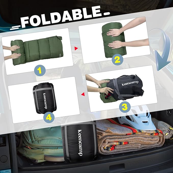 • Larger and Wider: Keencamp sleeping bag measures 74.80*33.07 inches, with a package size of 16.53*13.38*5.51 inches, weight 6.72lbs. The oversized sleeping bag for adults of 6 feet in tall, to provide enough space and even allow XXL individuals to move freely.