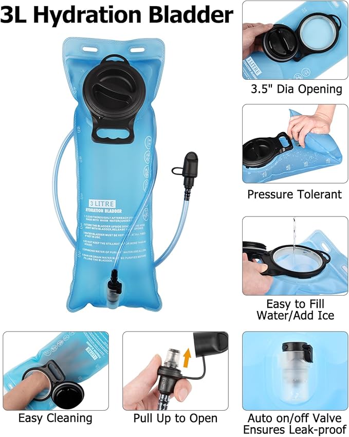 • Professional Leakproof 3L TPU Water Bladder - Our hiking water backpack packs with a 3L large capacity TPU hydration bladder, which is no BPA and odor, and has a 3.5” large open mouth, which is easy to clean and add ice cubes. And 3L large capacity ensures enough water supply for a long day’s exhausted hiking, trekking, biking.