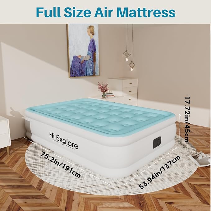 Air Mattress Full with Built in Pump Raised, Comfort Plush Self Inflating Mattress, Inflatable Blow Up Mattress, Portable Airbed for Home, Guests, Camping(Light Blue, 18” Height)