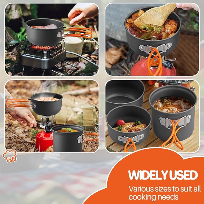 • 【Excellent Heat Conductivity】The Pots and Pans are Made od Anodized Aluminum for Excellent Heat Conductivity, Non-toxic and Lightweight. The Camp Cooking Set is Coated with a Nnon-stick Coating for Easy Cleaning and Durability