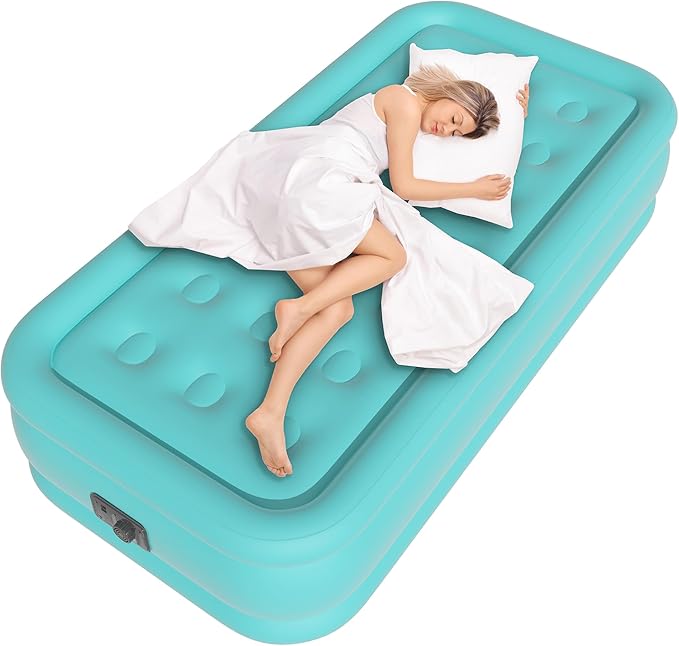 • HIGH QUALITY: This 18" twin size air mattress with built-in pump is designed with puncture-resistant PVC and topped with premium comfort flocking to prevent leaks and provide non-slip stability. Perfect for stay-at-home or sleepovers with friends or relatives.