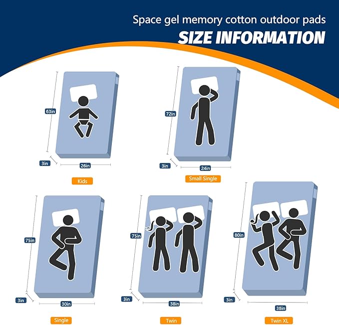 • 【MULTI-SIZE OPTIONAL & AFTER-SALES SERVICE WITHIN 24 HOURS】 5 sizes for you to choose from camping mattress full size, kids (63x26x3") small single (72x24x3”) single (75x30x3”) twin (75x38x3”) twin xl size (80x38x3”), Be sure to choose the most suitable size. Since we shipped by vacuum compression packaging, please Open the package and place it for about 24-48hours. If you have any question, feel free to contact us. Please believe that we will solve the problem for you within 24 hours.