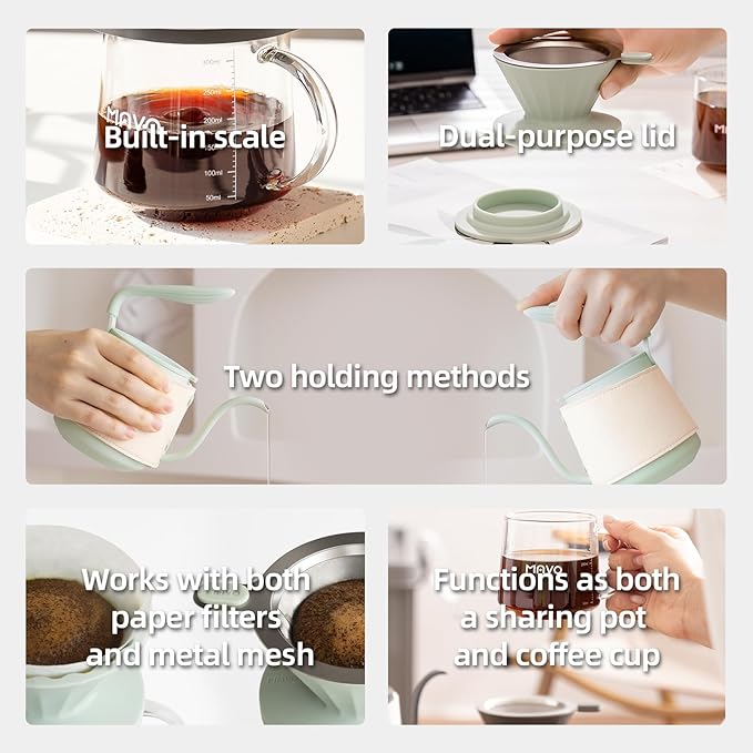 • Pour Over Coffee Maker Set, Pour Over Kettle, Coffee Dripper, Glass Coffee Server with Scale, Stainless Steel Filter