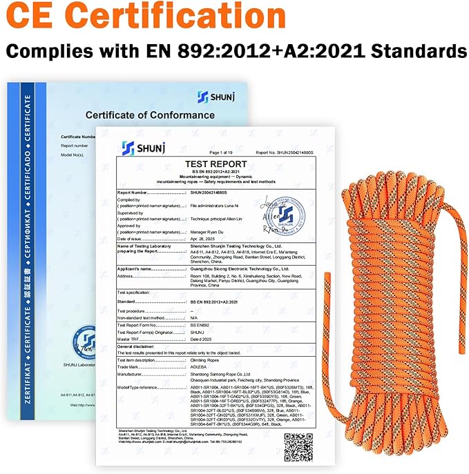 • CE Certified: Our static climbing rope meets the CE Certification of EN 892:2012+A2:2021 Standards (Certificate No. : SHUN2504214880SC), ensuring quality control. UV-Resistant & Abrasion-Proof give the rope a longer service life.