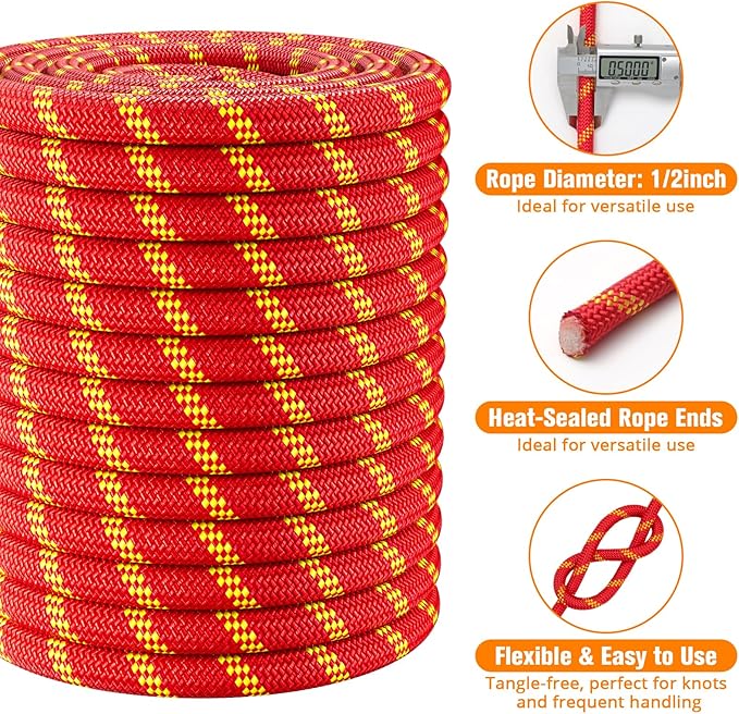 • High-Strength Polyester Structure: The double-braided polyester rope, made from high-strength fibers, offers excellent abrasion and tensile strength, staying stable in extreme conditions—perfect for outdoor activities. With a 1/2-inch diameter, 5,200 lbs breaking strength, and 100 feet length, it reliably meets professional task demands