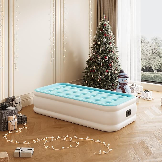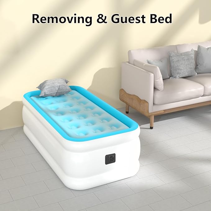 • HIGH QUALITY: This 18" twin size air mattress with built-in pump is designed with puncture-resistant PVC and topped with premium comfort flocking to prevent leaks and provide non-slip stability. Perfect for stay-at-home or sleepovers with friends or relatives.