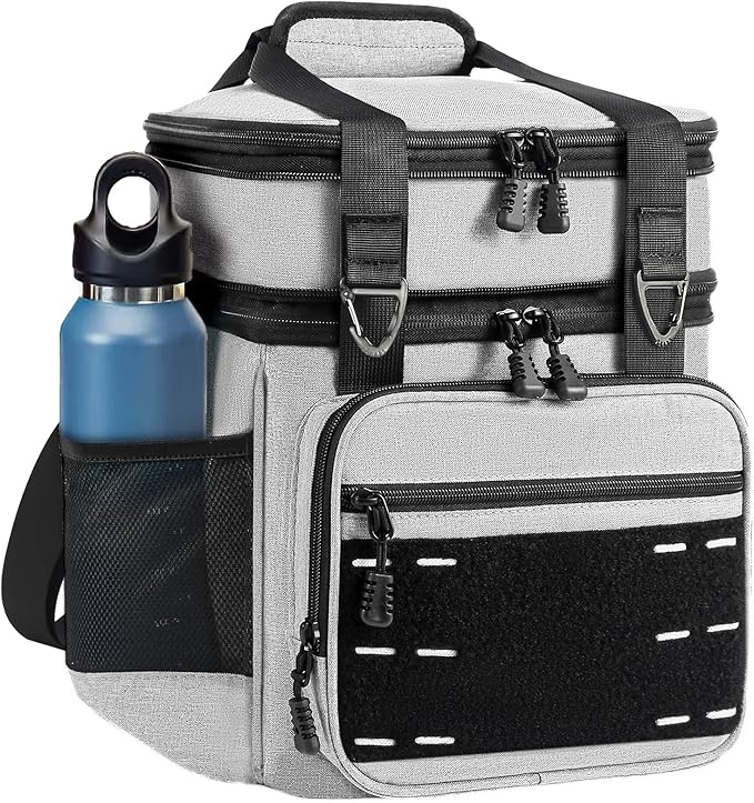 • Multi Functions: This large lunch box has many different compartments to accommodate your needs. Side pockets to keep koozies, water bottles, and wallet. A zip mesh pocket on top to store utensils and napkins. The front zippered pockets are good for things like wallets, phones, or keys. It's easy to carry with the adjustable shoulder strap or the handles even if the tactical lunch box is full and heavy.