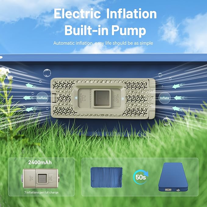 • Rechargeable and Removable Smart Charging Pump - Our portable pump features a robust 2400mAh battery capacity, delivering rapid inflation for camping mats within 50 seconds. After a full charge (3-4 hours), it supports up to 7 automatic inflation cycles. This design allows you to spend less time setting up gear and more time embracing nature's serenity
