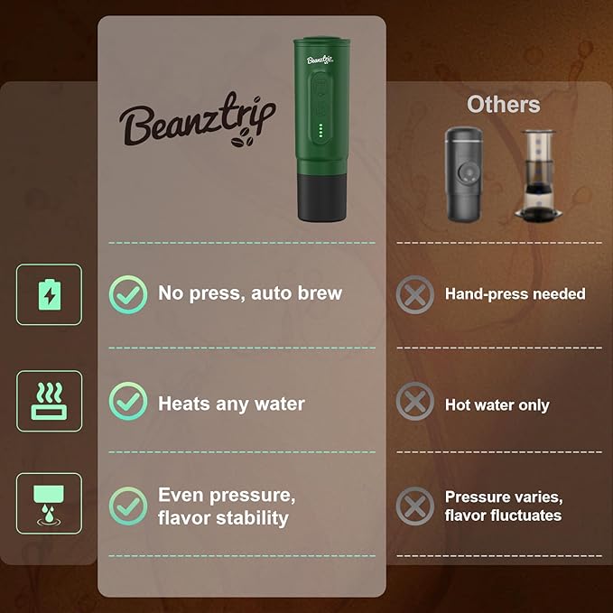 • 【Extended Battery Life】200+ cups per charge - engineered for outdoor! The high-capacity battery heats water for 200+ cups (pre-heated) or 4-5 full brew cycles (from cold to hot). BeanzTrip travel coffee maker is suatible for multi-day trips without power sources