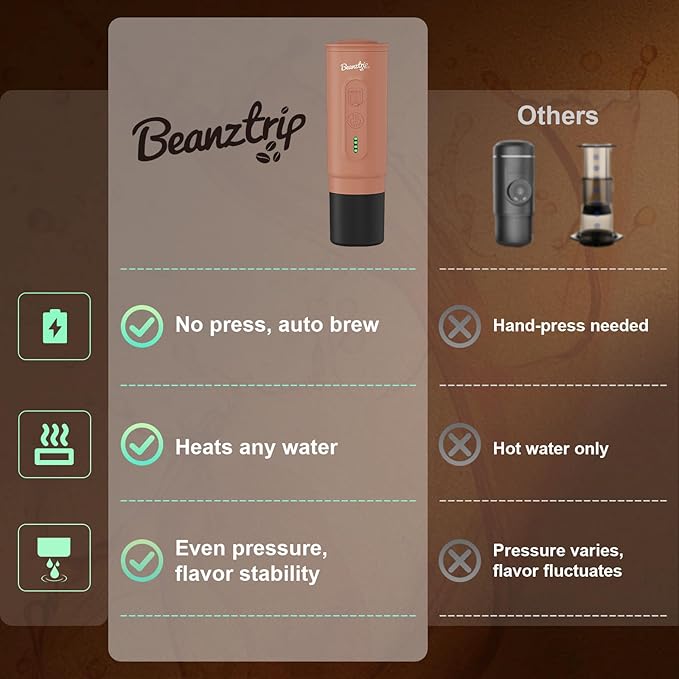 • 【Extended Battery Life】200+ cups per charge - engineered for outdoor! The high-capacity battery heats water for 200+ cups (pre-heated) or 4-5 full brew cycles (from cold to hot). BeanzTrip travel coffee maker is suatible for multi-day trips without power sources