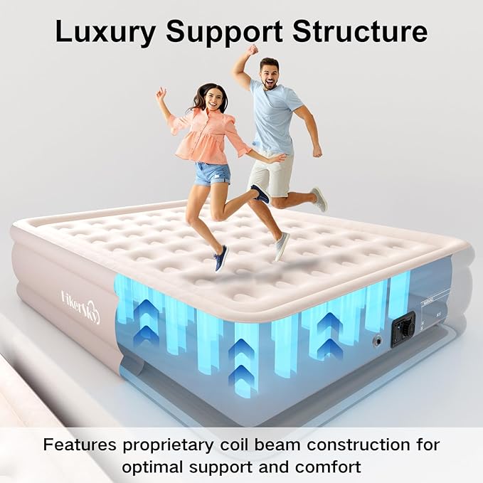 • QUICK SELF INFLATING: The queen air mattress has a built-in pump with dual air chambers, dual air chambers work simultaneously. It only takes 3 minutes to inflate and deflate.