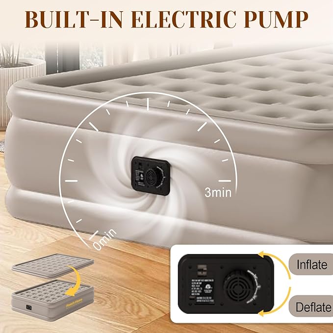 • QUICK SELF INFLATING: The queen size air mattress has a built-in pump with dual air chambers, dual air chambers work simultaneously. It only takes 3 minutes to inflate and deflate, all night stability no lost air. The electric pump information is 120VAC, 60Hz, 1.2A.