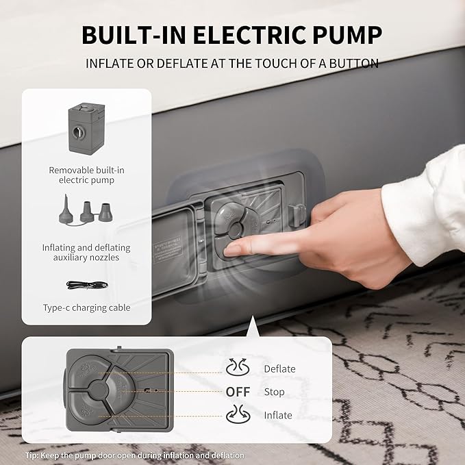 • UPGRADED PATENTED BUILT-IN PUMP: Rechargeable built-in pump with 3-minute one-touch inflation or deflation frees up your hands and gets you comfortable on your mattress in the time it takes for a cup of coffee. Comes with Type-C charging cable and three types of nozzles, the air pump can be removed separately to inflate other air mattresses or inflatable pillows