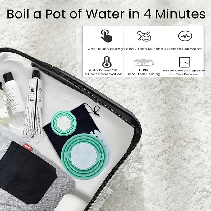 • [Quick Water Boiling and Coffee Brewing]With one-button design, the travel kettle offers quick and easy operation, able to boil a pot of water in about 4 minutes. Add your favorite coffee grounds into the collapsible coffee filter, pour over hot water, now you get a cup of stong pour over coffee in a few minutes, saving time and effort, perfect for busy mornings or while on-the-go.
