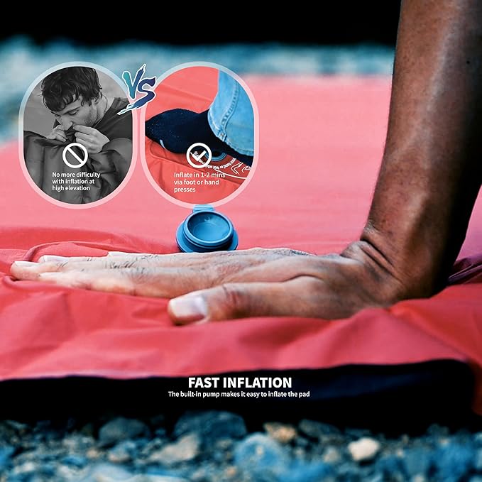 • ✅FAST INFLATION w/ BUILT-IN PUMP - Inflate this camping mattress in 2-3 mins via foot/hand presses—no extra pumps or batteries needed. The built-in pump features a one-way valve to prevent backflow, plus a two-stage deflation system for easy firmness adjustment and quick packing. Faster setup than standard pads for hassle-free camping.