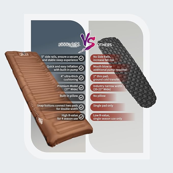 • ✅PREMIUM MATERIAL & EXTRA WIDTH - Crafted from exclusive anti-tear TPU-laminated fabric, this air mattress pad blends soft touch with rugged durability. Tested 50% quieter than nylon mats for undisturbed starry-night sleep. At 27”W (3-7" wider) x 76”L, its extra-wide design eliminates crampedness, offering ample stretch space for outdoor comfort.