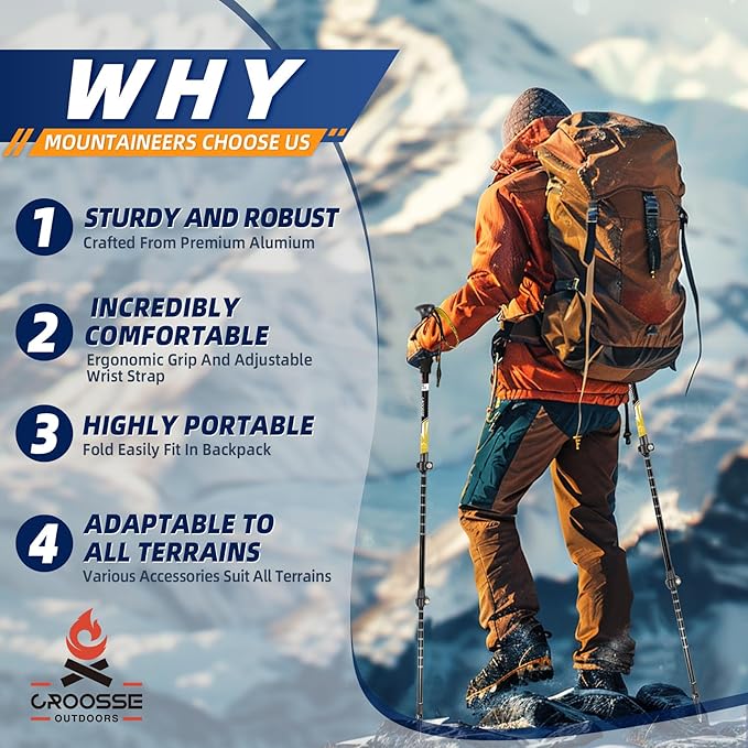 • ADJUSTABLE AND VERSATILE: From 4'11"(150cm) teens to 6'5"(196cm) mountaineers, one set conquers all. Hiking sticks collapse to ultra-compact 23"(58cm) for strapping to packs, or extend to 53"(135cm) for snowshoeing stability. Our lightweight walking sticks provide comfort and support, making them ideal for kids, seniors, women, and men of all fitness levels. Whether you're skiing, hiking, snowshoeing, or Nordic walking, they adapt to your needs