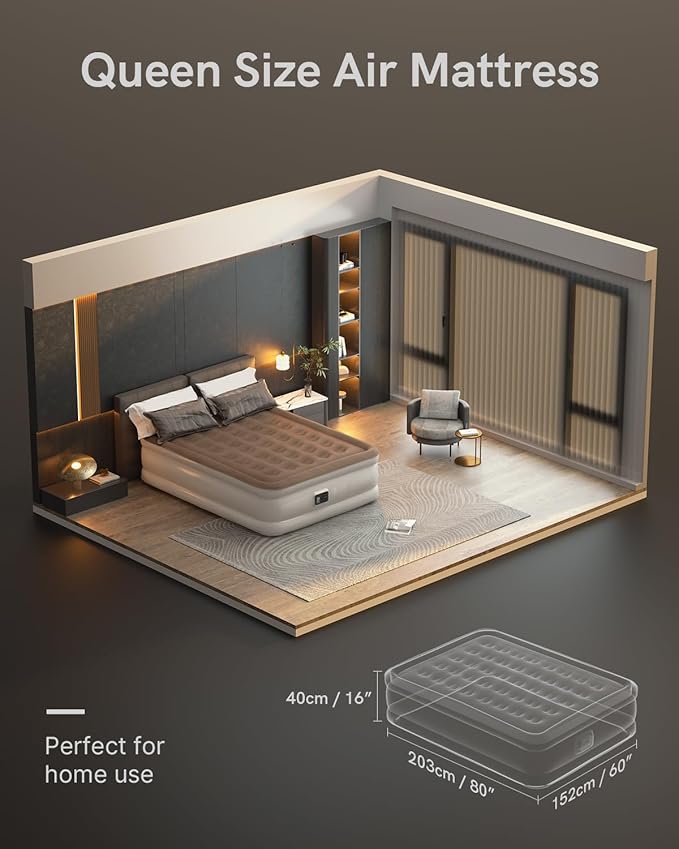 • Air Mattress Queen Size: This queen air mattress measures 80×60×16 inches, offering spacious and comfortable space, just like sleeping on a real bed