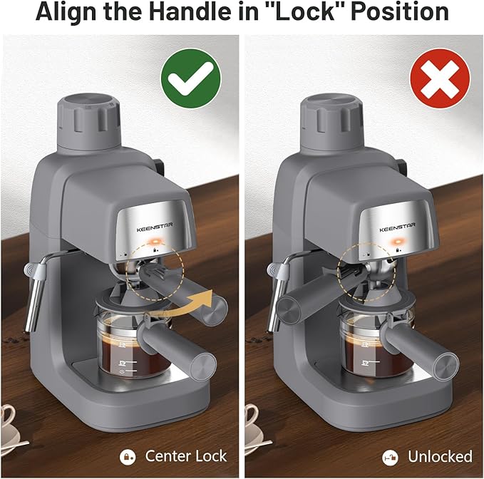 • NOTICE: 1. FILTER MUST BE FULLY LOCKED! Pls always turn the handle to the lock symbol on the head of machine. 2. Don’t use too fine coffee ground, only medium ground is suggested. 3. Please clean the coffee ground on the edge of the filter.