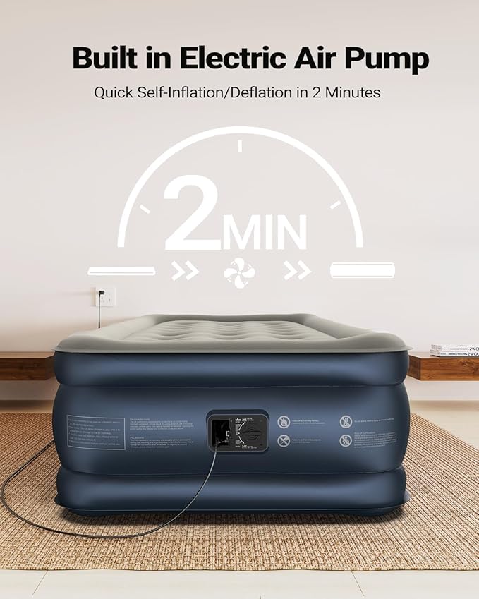 • Self Inflating Air Mattress: This Twin XL air mattress with built in pump, comes with an upgraded electric pump, can quickly inflate/deflate within 2 minutes, making twin air mattress more convenient and efficient to use