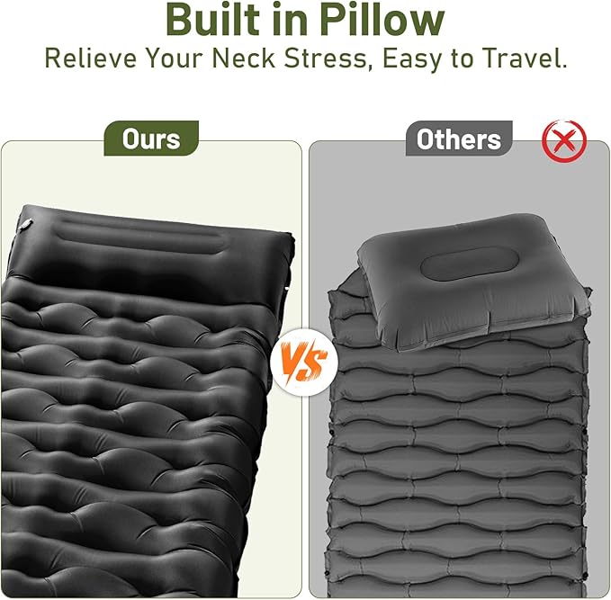 • 【Silent Comfort】Made with 200T pongee for a smooth, quiet feel, plus TPU lining for enhanced durability. This sleeping mat won’t squeak like nylon when you turn and twist. Built for peaceful sleep-Ideal for camping, car trips, or backpacking, where restful sleep matters most.
