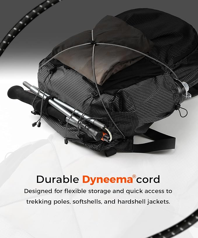 • Unique Functional Design: The backpack is equipped with elastic straps and buckles to accommodate trekking poles or adjust the webbing as needed. The luminous rope wrapped around the outside of the backpack makes you safer at night.